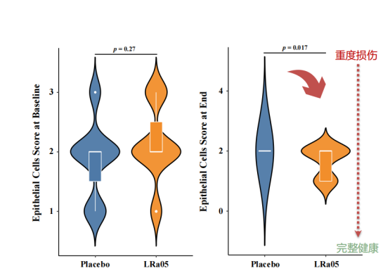 干预前,阴道上皮细胞评估提示受试者阴道黏膜屏障处于重度损伤状态,干预后,安慰剂组受试者阴道上皮评分无明显变化,而LRa05干预组显著降低,表明LRa05能够有效改善阴道上皮细胞脱落情况,提高其完整性,有助于黏膜屏障的修复。