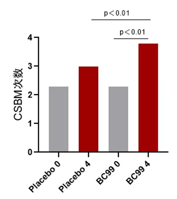 干预4周后,BC99组的平均每周完全自发性排便(CSBM)次数显著增加。数据显示,受试者从基线的2.3次/周提升至3.8次/周。表明受试者从临床定义的“便秘状态”(通常<3次/周),有效回归到正常的肠道节律频率。