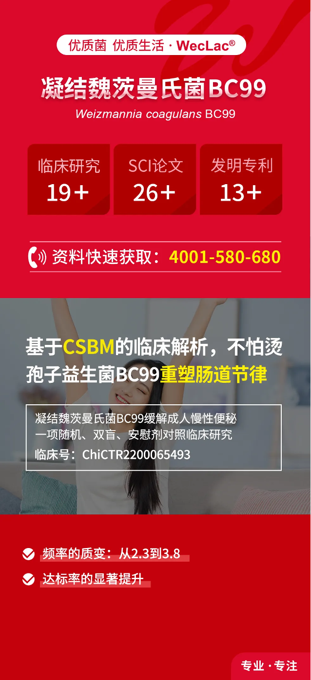 CSBM作为便秘疗效评价中的核心临床终点指标,能够客观、精准地反映排便功能的改善程度,也是学术界与行业内公认的关键评价标准。依托凝结魏茨曼氏菌BC99的临床研究数据,这一菌株在便秘干预中的应用价值,正得到更加清晰的科学阐释。