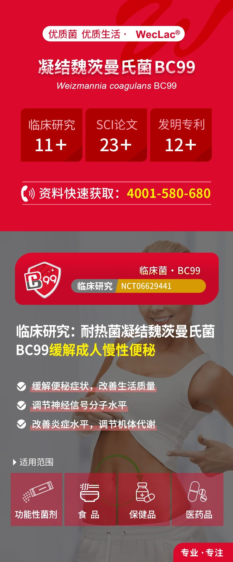 当久坐办公、速食外卖、精神压力大等现代生活方式日益普遍,慢性便秘的患病风险也显著增加。慢性便秘是一种常见的功能性肠病,其成因复杂,与结肠蠕动缓慢、肠道菌群失调及心理因素密切相关,严重影响生活质量。我国约有1.2亿人长期受便秘困扰,老年群体患病率高达22%。传统泻剂存在依赖性高、疗效个体差异大等问题。临床研究发现,凝结魏茨曼氏菌BC99(Weizmannia coagulans BC99)能通过调节神经信号分子,改善炎症反应,调节代谢等多种途径缓解便秘