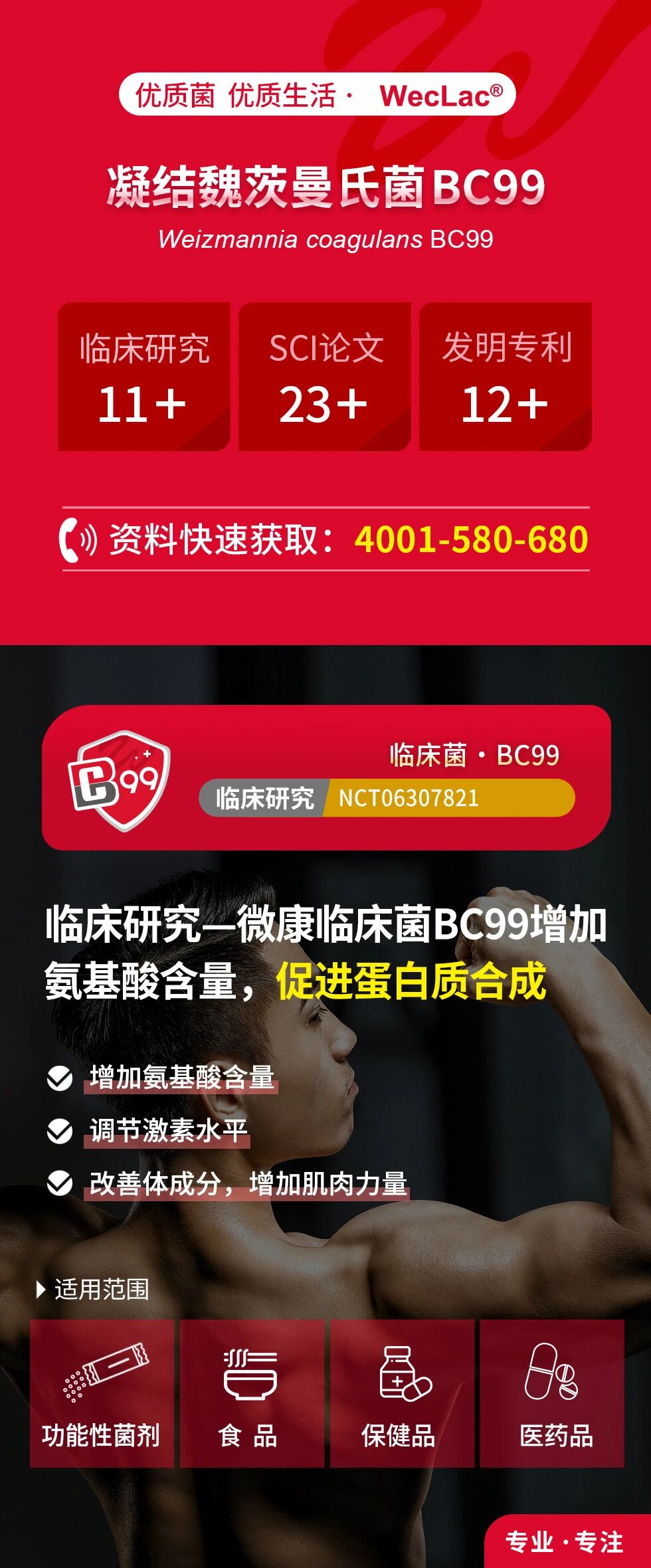 蛋白质是维持人体健康与运动表现的关键因素,其在胃肠道中的充分消化与吸收,对于运动人群,老年群体的体能恢复和肌肉流失具有积极的促进作用。益生菌作为一种安全的膳食补充剂,其通过调节肠道菌群、增强消化酶活性以改善营养物质消化吸收的潜力受到关注。本研究发现凝结魏茨曼氏菌BC99能够通过增强蛋白质消化和氨基酸吸收,通过“肠-肌肉轴”,促进骨骼肌合成代谢,为运动营养领域提供新思路。