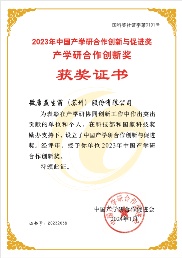 3月17日,第十五届中国产学研合作创新大会在北京隆重举行,第十三届全国政协副主席、中国科协主席万钢,第十二届全国政协副主席、中国科学院院士韩启德,第十三届全国政协副主席辜胜阻,教育部党组成员、副部长孙尧,工业和信息化部副部长徐晓兰,国家知识产权局党组成员、副局长卢鹏起,科技部以及国家自然基金委员会、中国科学院、中国工程院、中国科协、全国工商联等“政、产、学、研、金、服、用”各界1000余代表出席大会。大会对推进产学研协同创新工作中作出突出贡献的先进单位进行表彰。微康益生菌荣获“2023年中国产学研合作创新奖”。
