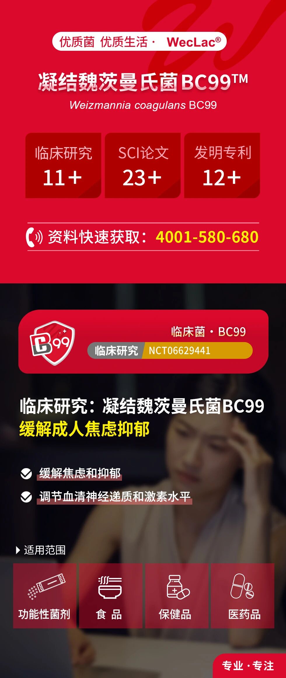 在这个焦虑与抑郁日益成为“隐性流行病”的时代,越来越多人开始寻求超越传统药物的干预方式,包括正念冥想、心理咨询、运动疗法和营养干预等。其中,以肠道菌群为靶点的解决方案逐渐受到重视,这背后的科学基础,正是“肠-脑轴”。肠-脑轴是肠道与大脑之间的双向通信系统,肠道微生物群不仅参与消化,还作为一个活跃的内分泌器官,持续向大脑发送化学信号,影响神经与情绪状态。因此,通过改善肠道菌群来调节情绪成为一种可行路径,益生菌正是基于这一机制发挥情绪干预作用。它们并非简单“补充”微生物,而是在摄入足够剂量时,通过重塑失衡的肠道微生态,调控神经免疫和内分泌功能,从而在情绪健康领域展现出重要潜力。临床研究表明,凝结魏茨曼氏菌BC99能够有效缓解焦虑和抑郁症状,改善睡眠质量,有助于情绪健康。
