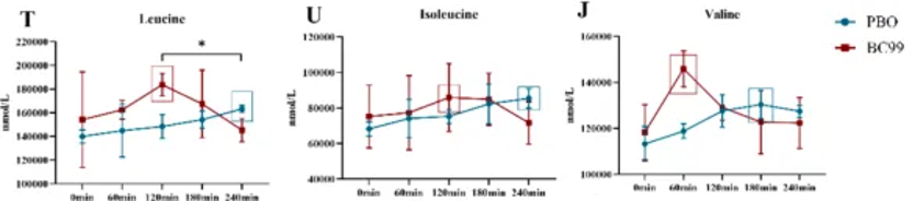 临床研究表明BC99干预后,受试者的血浆氨基酸(如亮氨酸、异亮氨酸、缬氨酸等支链氨基酸)达峰时间比对照组提前1-2小时,且峰值浓度更高。BC99能够增加血浆中氨基酸浓度,增加蛋白质消化与吸收。