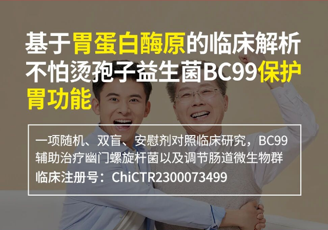 长期感染幽门螺杆菌可能导致一系列不同程度的胃肠道疾病,如慢性胃炎、消化不良和消化性溃疡等。微康益生菌的自研菌株孢子益生菌BC99在辅助幽门螺杆菌治疗方面取得积极的结果。