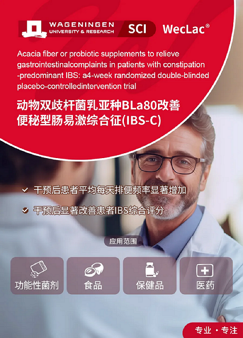 该临床研究是由微康益生菌研究院与荷兰瓦格宁根大学联合开展,目的是评估确定益生菌动物双歧杆菌乳亚种BLa80补充剂4周干预对以明显便秘症状为主的肠易激综合征(IBS-C)患者的排便模式、IBS相关症状和生活质量的影响,采用平行、双盲、随机对照试验设计。