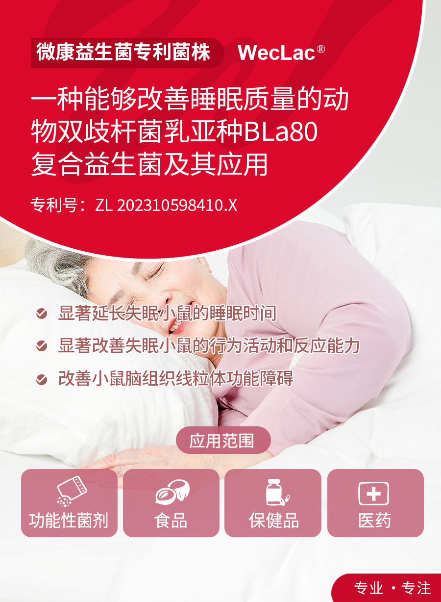 本研究采用改良版水平转盘睡眠剥夺法构建失眠小鼠模型,然后分组进行系列试验。该研究证明了动物双歧杆菌乳亚种BLa80及其复合益生菌BLa80+LC16在缓解失眠小鼠症状方面取得了显著成效。这些益生菌不仅能明显延长失眠小鼠的睡眠时间,还显著改善了它们的行为活动和反应能力。此外,实验还发现这两种益生菌有助于修复脑组织线粒体功能,并促使脑组织ATP浓度回升,为脑部健康提供了有力的支持。