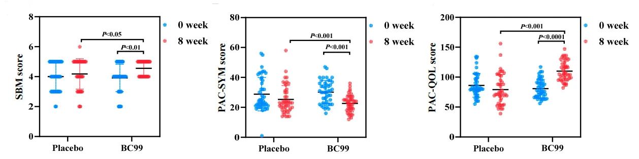 BC99组受试人群每周完全自发排便次数(SBM)显著高于安慰剂组,便秘症状评分(PAC-SYM)显著低于安慰剂组,便秘生活质量(PAC-QOL)评分显著高于安慰剂组,表明BC99能有效增加排便频率,显著改善受试者的便秘严重程度和生活质量。