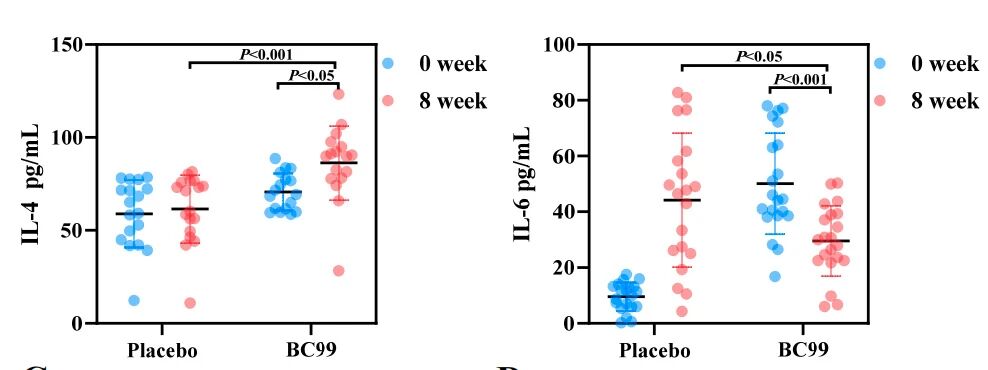 慢性便秘常伴有炎症,BC99干预后,受试人群血清中抗炎因子白介素-4(IL-4)水平显著升高,促炎因子白介素-6(IL-6)水平显著降低,表明BC99能够减少因炎症导致的蠕动乏力,恢复肠道正常蠕动功能。