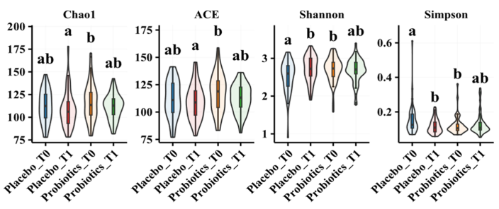 收集受试人群粪便样本,分别测定肠道菌群和短链脂肪酸(SCFAs)的水平。结果表明,安慰剂组人群在干预后出现α多样性的显著变化,而BLa80+LRa05复合益生菌干预后未观察到显著变化,表明酒精摄入可能会影响微生物群落的多样性,而益生菌可能起到了稳定肠道菌群的作用。同时,益生菌干预后,受试人群粪便中乙酸、戊酸和总SCFAs水平显著升高,表明益生菌有助于肠道有益代谢产物的富集,起到调节胃肠健康的作用。