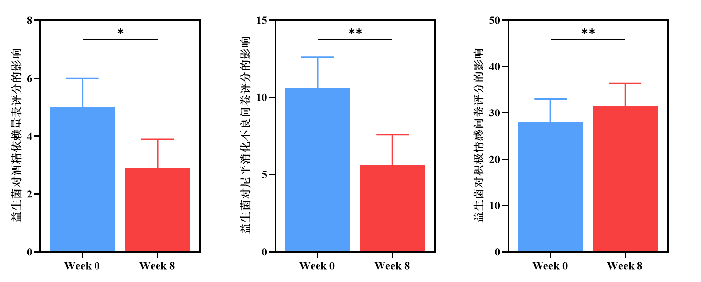 通过酒精依赖量表(ADS)、尼平消化不良指数(NDI)和正负性情感量表(PANAS)评估BLa80+LRa05复合益生菌对受试人群的情绪健康影响。结果表明,干预8周后,益生菌组酒精依赖评分、消化不良评分显著降低,积极情绪得分显著提高,表明BLa80+LRa05复合益生菌能够显著改善饮酒人群的情绪和身心健康。