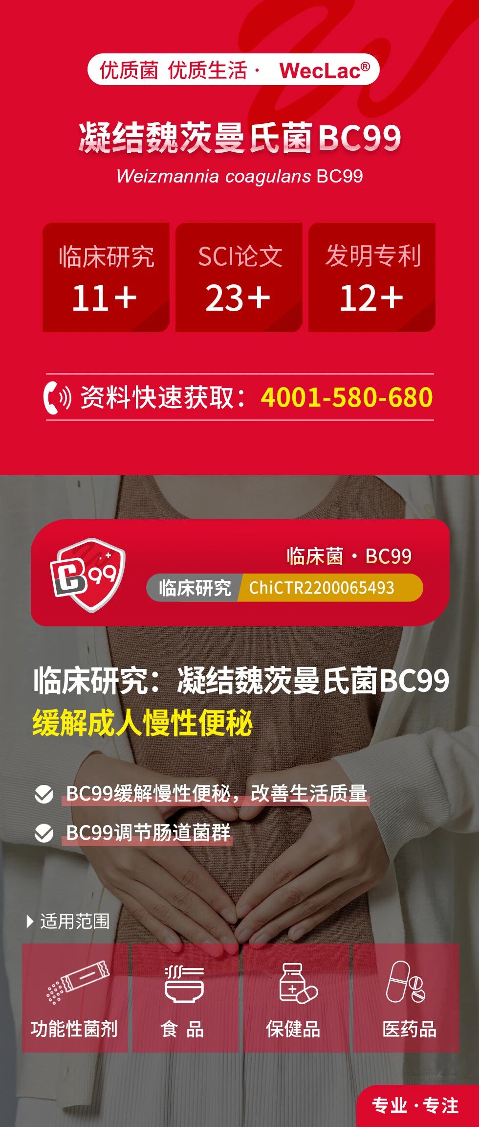 本研究采用随机、双盲、安慰剂对照试验,共纳入100例18-65岁,每日服用20亿CFU BC99,连续4周。
