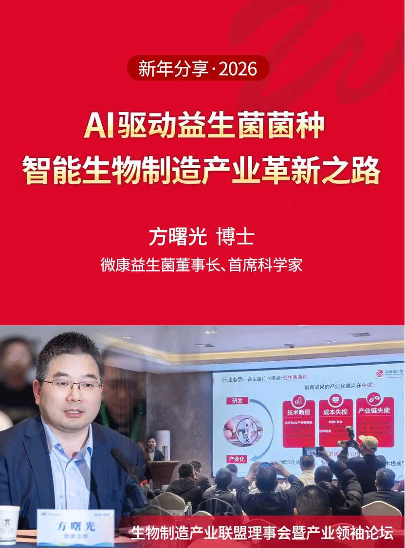 2026 年1月15日,微康益生菌董事长方曙光博士在“生物制造产业联盟理事会暨产业领袖论坛”分享报告并阐述了AI 驱动益生菌“菌种开发-制造-应用” 全链条智能化升级路径。