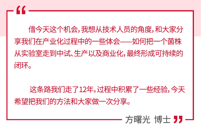 针对这些挑战,我们创业以来始终坚守"六个字":产业化、功能性。跟学术研究机构相比,从菌株开发的第一天就把"能不能产业化"(高密度培养、高抗逆性和稳定性等)放在前面;如果不能产业化,即使功能再强,我们也不会选。跟产业化同行相比,我们同样强调两点:菌株来源及基础研究是否可靠、功能验证是否扎实。我们就用这"六个字"长期约束自己,推动事情真正落地。