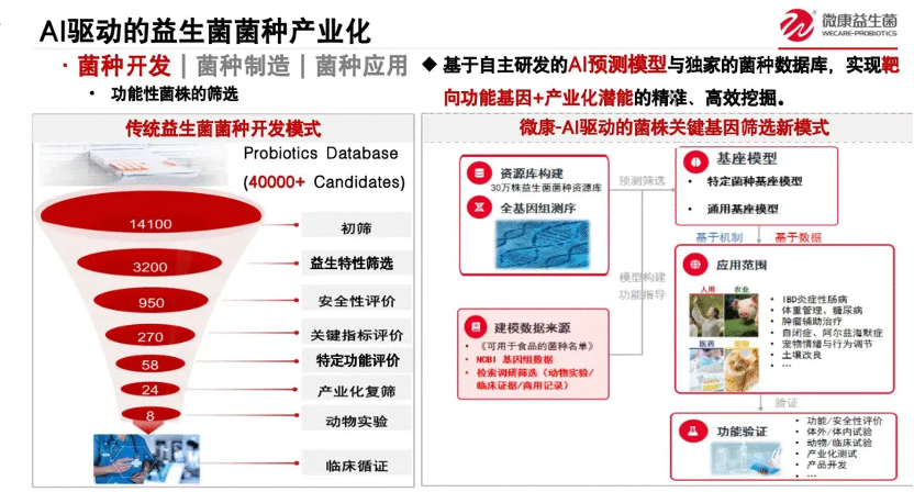 菌株来了以后,第二点是功能验证。尤其在人用这一块,微康前期做了上百项临床,积累了大量人群数据;在此基础上再导入AI,速度就明显提升。以前拿到一个菌株,到完成一轮临床验证,往往需要两年;现在微康最快可以做到6~12个月。这是加速功能菌株产业化非常关键的一步。