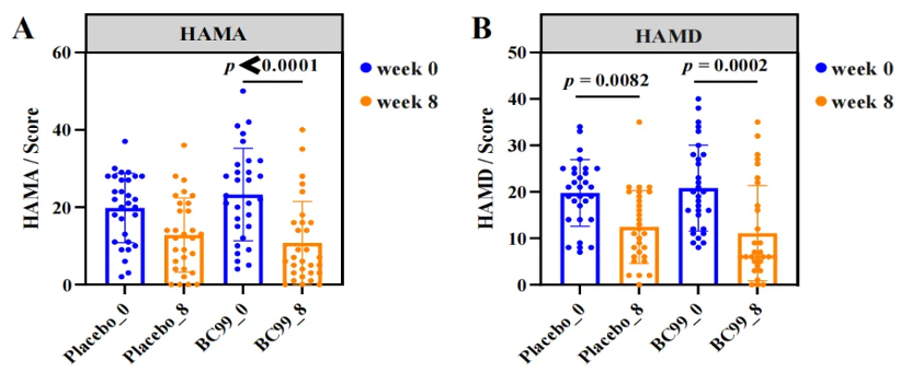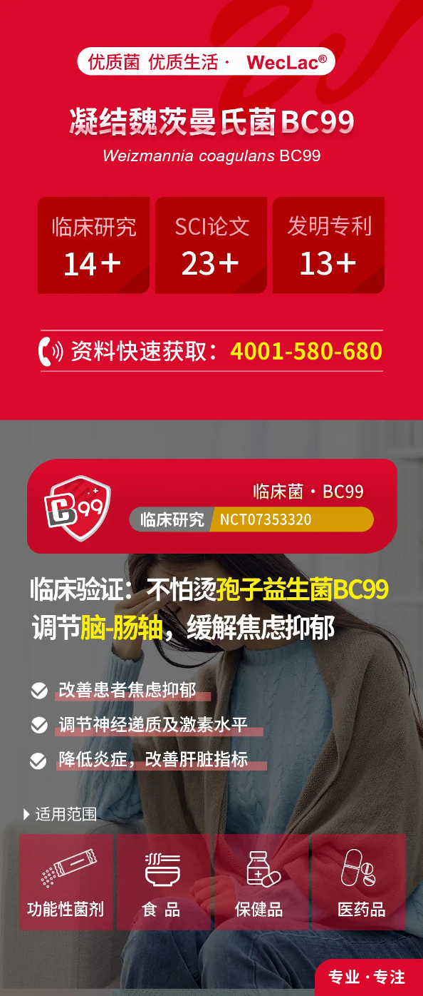 临床试验证实,BC99能有效改善焦虑与抑郁症状,提升患者睡眠质量,缓解情绪及认知功能,并调节血清中血清素,皮质醇等生物标志物水平。此外,它还能清除机体炎症,改善肝脏指标,从而进一步改善日常情绪与认知状态,缓解压力,促进身心整体平衡。