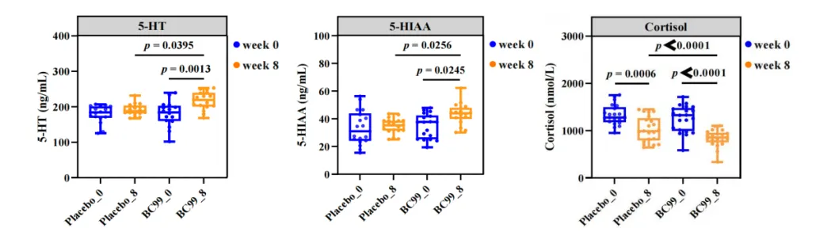 与安慰剂组相比,BC99干预能显著增加血清素(5-HT),5-羟基吲哚乙酸(5-HIAA)水平,显著降低皮质醇水平,表明BC99能够调控神经递质和激素水平,可能通过调节下丘脑-垂体-肾上腺(HPA)轴来调控皮质醇分泌,从而改善心理状态。