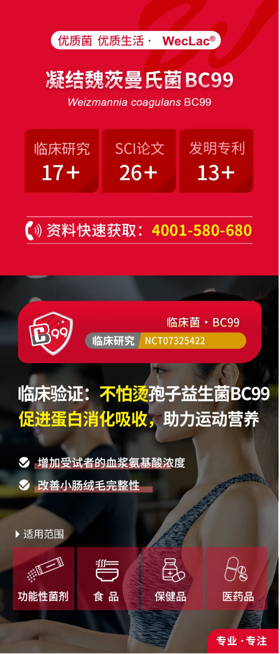 本研究通过人体临床试验与动物模型验证相结合的方式,系统探究不怕烫孢子益生菌BC99对运动人群蛋白质消化吸收的影响。微康益生菌为客户提供通过改善肠道环境来提升蛋白质生物利用度的创新方案。