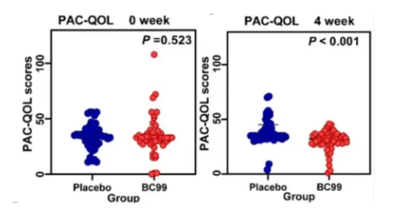 4 周 BC99 干预后,BC99 组的 PAC-QOL 评分出现显著下降,评分从基线期的较高水平大幅降低,说明便秘对患者心理困扰、生理不适及社会功能的负面影响得到了显著缓解。