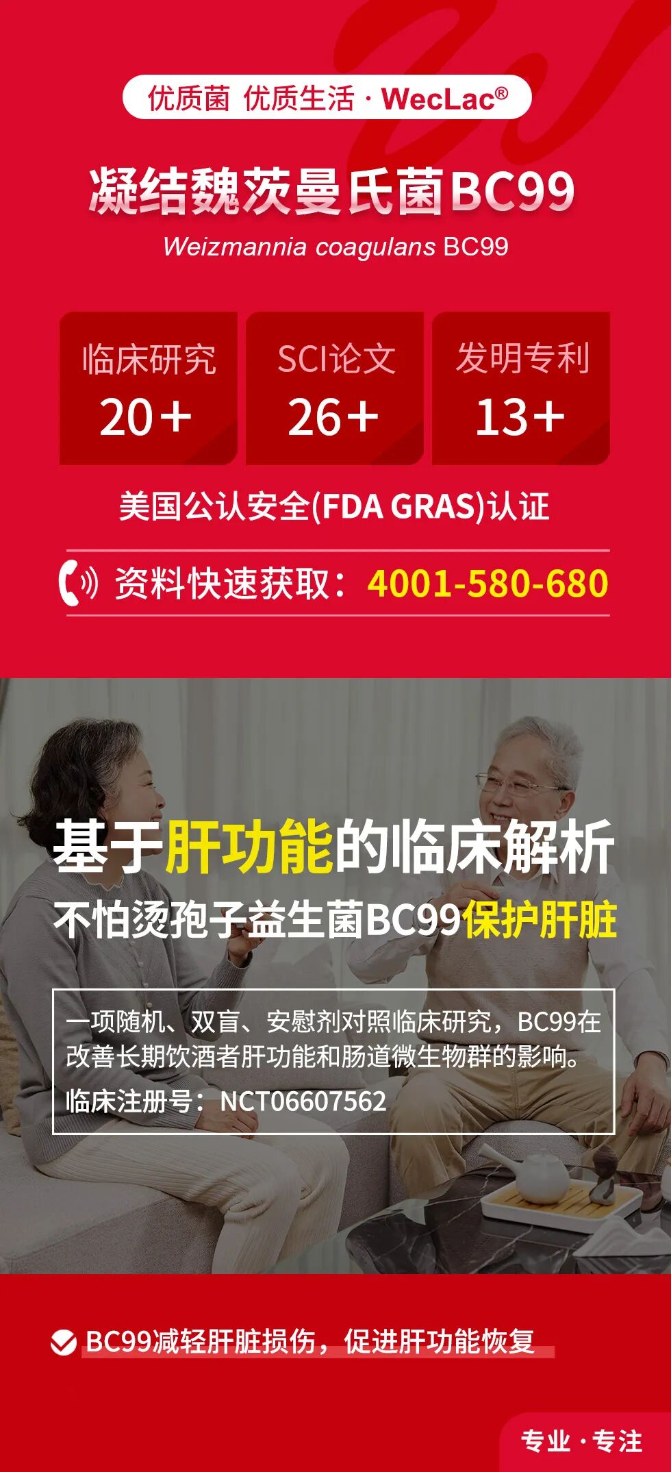 作为微康益生菌的王牌菌株,凝结魏茨曼氏菌BC99始终坚持循证医学路径,以临床循证为支撑,用数据验证价值。BC99能显著改善肝功能指标,展现出卓越的护肝潜力,为饮酒带来的肝损伤干预提供了安全且有效的新选择。