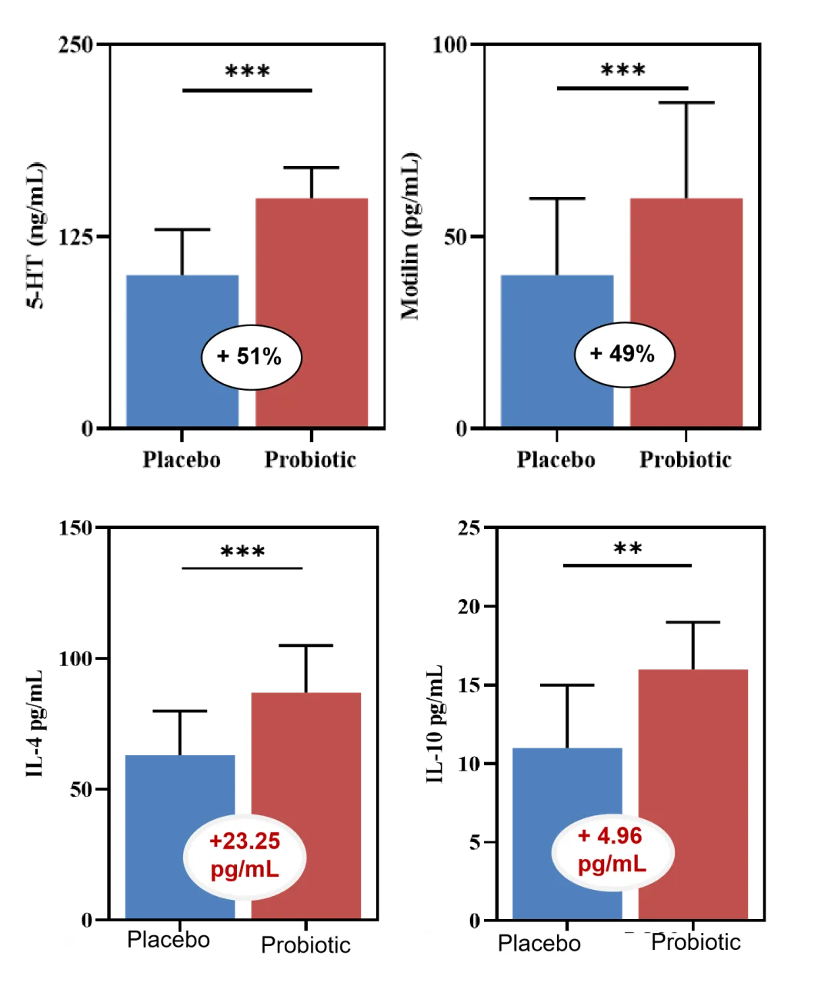 临床研究发现,BC99有效增加排便次数,改善受试者的便秘症状(腹痛、腹胀、焦虑等),提升生活质量;显著提高便秘受试者的血清素和胃动素水平,通过调节肠道神经递质和激素,增强肠道蠕动,从而缓解便秘;显著提高患者免疫因子水平,改善炎症,缓解便秘[1]。