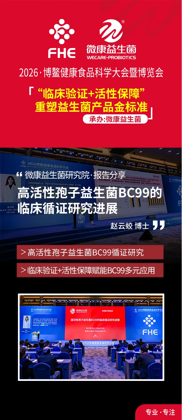 2026年3月13日,2026博鳌健康食品科学大会暨博览会(FHE)的精彩继续。在由微康益生菌承办的《“临床验证+活性保障”重塑益生菌产品金标准》专题论坛上,微康益生菌应用技术总监赵云蛟博士带来了题为《高活性孢子益生菌BC99的临床循证研究进展》的分享。她深入剖析了高活性孢子益生菌凝结魏茨曼氏菌BC99的临床循证研究成果,阐释了“临床验证+活性保障”如何赋能BC99实现多元应用,为市场端的益生菌产品创新升级提供了科学论证支撑与明确方向指引。