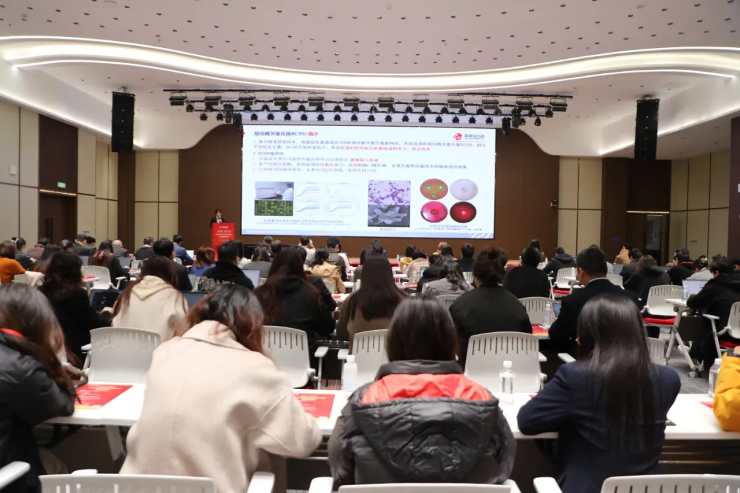 大会致辞中,微康益生菌质量中心总经理夏九学重点介绍了明星菌株凝结魏茨曼氏菌 BC99(原凝结芽孢杆菌)。该菌株是微康从内蒙古健康婴儿肠道中发现,已开展 19 项以上临床研究,发表 26 篇以上 SCI 论文,获得 13 项以上发明专利。因为耐热特性,BC99 已广泛应用于热冲茶饮、咖啡、代餐粉、燕麦片、益生菌软糖、坚果及矿泉水等产品。中国食品发酵工业研究院刘明、中国质量检验检测科学研究院薛晓晶等专家提出,凝结芽孢杆菌产业化需完善检测体系,期待多方协同推进行业标准化。