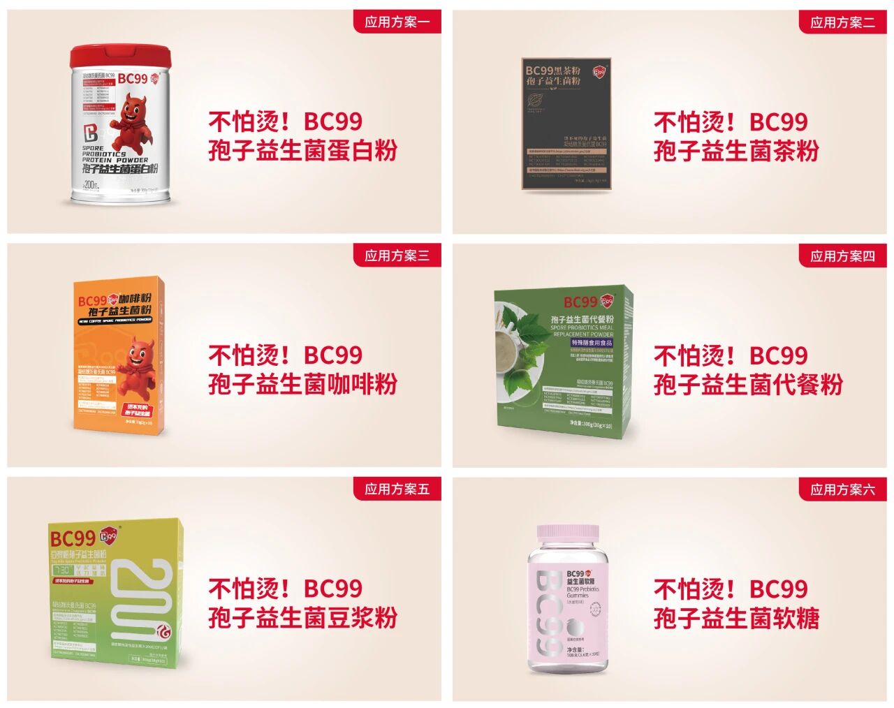 依托优异稳定性,BC99 打破应用边界,覆盖膳食补充剂、高温冲调饮品、常温酸奶、软糖、坚果及益生菌矿泉水等品类,适配各类食品加工工艺,让益生菌走进生活,守护全民健康。
