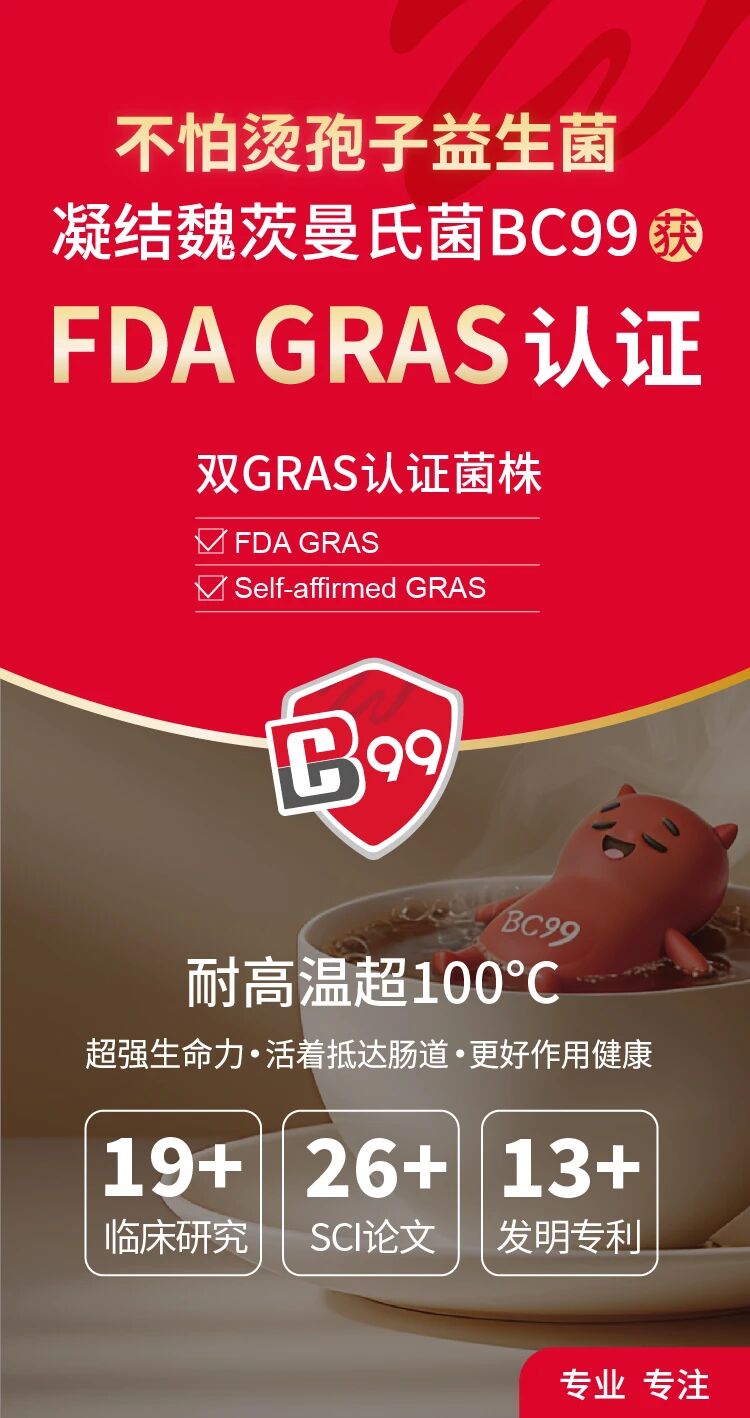 近日,继动物双歧杆菌乳亚种BLa80、鼠李糖乳酪杆菌LRa05斩获双GRAS认证后,微康益生菌再传喜讯。旗下核心菌株不怕烫孢子益生菌BC99,正式通过美国 FDA GRAS 认证,成为公司又一株双 GRAS 认证菌株,彰显微康益生菌的硬核科研实力。