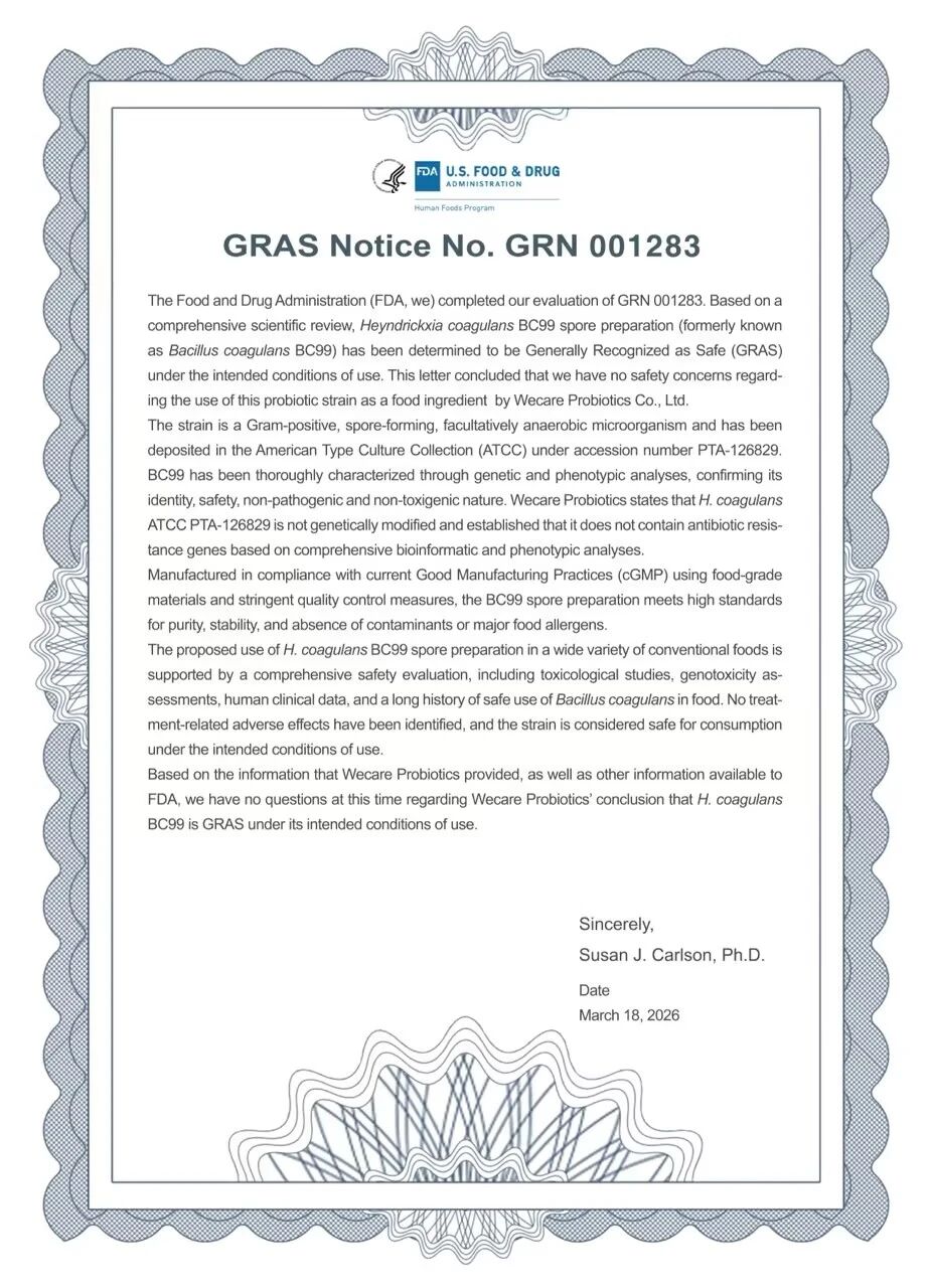此次 BC99 获美国 FDA GRAS 认证,既是对菌株品质与安全性的高度认可,也是中国益生菌获得全球市场认可的重要标志。未来,微康益生菌将持续深耕菌种研发与产业化应用,推动本土益生菌走向世界,让更多人受益于科学益生菌带来的健康福祉。