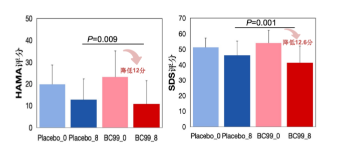 通过汉密尔顿焦虑量表(HAMA)和抑郁自评量表(SDS)对受试者情绪状况进行评估,结果表明,BC99干预后,受试者HAMA评分降低12分(由重度焦虑转为轻度焦虑),SDS评分降低12.6分(由轻度抑郁转为正常),且评分均显著低于安慰剂组,表明BC99能显著改善成人的焦虑和抑郁。
