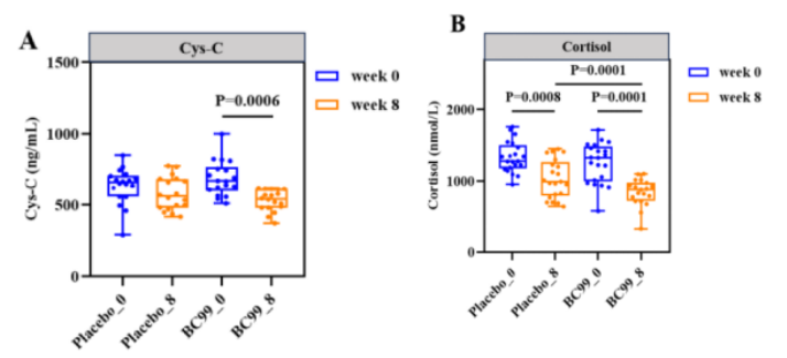 通过测定血清中胱抑素C(Cystatin C,Cys-C)和皮质醇(Cortisol)的水平,分析BC99对受试者血清神经递质和激素的作用。结果表明,BC99干预后,Cys-C和皮质醇均显著降低,其中,皮质醇水平显著低于安慰剂组。这些结果表明BC99可能通过特定机制调控部分神经递质和激素水平,从而在焦虑和抑郁改善中发挥潜在作用。