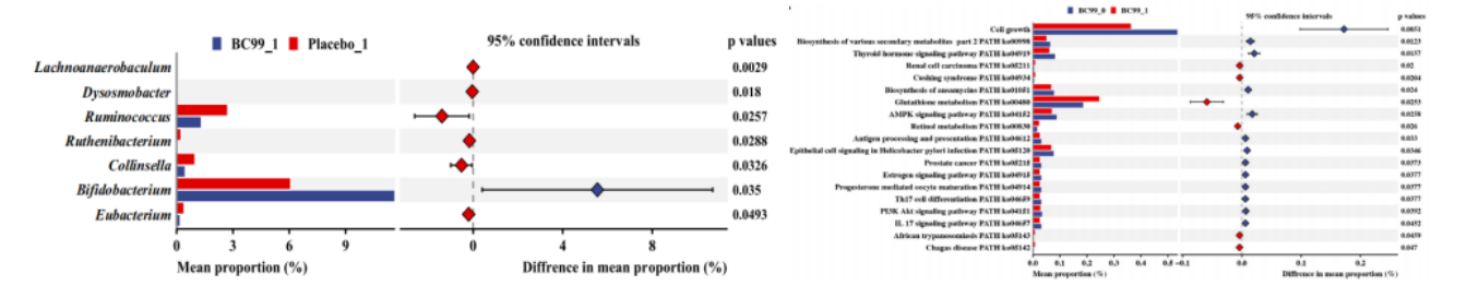 BC99显著提高便秘患者肠道中双歧杆菌属等有益菌丰度,抑制潜在有害菌,影响谷胱甘肽代谢等关键途径,帮助减少肠道氧化应激,增强肠道屏障,改善肠道环境。