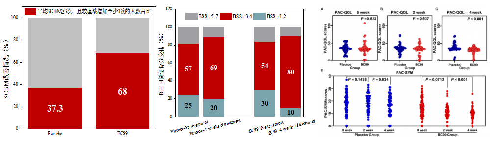 4周临床研究显示,BC99组增加便秘患者的每周排便次数,排便频率从“便秘”状态进入了“正常”范围。根据布里斯托大便分类法,BC99干预后显著改善大便性状,告别干硬颗粒,恢复香蕉状健康便。同时缓解便秘带来的身体症状(如腹胀、腹痛、排便费力、大便干硬等问题、精力不济等),显著提升因便秘患者的生活质量。