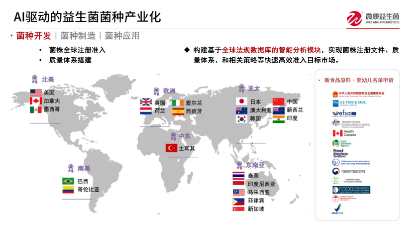 第三点是注册/准入。无论国内还是国际,现在对益生菌菌株的要求越来越严。国内以前更多停留在"到种的水平",现在肯定要到"株的水平"。国外推进更早,除了要到株的水平,很多菌株还要按目标市场的流程去做合规,比如美国市场常见的GRAS路径等。更现实的是,各国流程和要求还在变化:进美国、进欧盟,尤其这几年进入一些新兴市场(例如东南亚),监管往往更细、更严。微康在这方面有自己的积累,因此在品种开发和商业化变现过程中,会同步把注册准入体系导入进来。