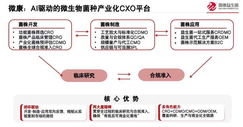 公司以前更多做"食用益生菌",大家也习惯叫我们"益生菌公司或益生菌菌种公司"。如今,微康突破业务边界,定位为面向微生物菌种产业化的一站式平台企业,对外以CXO模式提供全链条菌种服务: