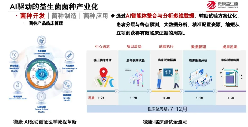 菌株来了以后,第二点是功能验证。尤其在人用这一块,微康前期做了上百项临床,积累了大量人群数据;在此基础上再导入AI,速度就明显提升。以前拿到一个菌株,到完成一轮临床验证,往往需要两年;现在微康最快可以做到6~12个月。这是加速功能菌株产业化非常关键的一步。
