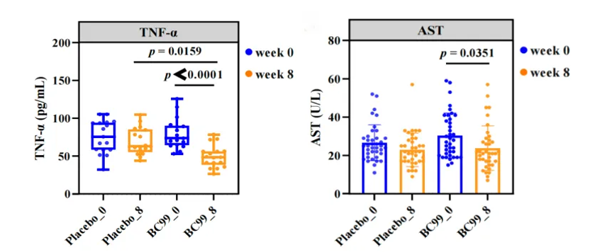 与安慰剂组相比,BC99干预后,细胞因子肿瘤坏死因子-α(TNF-α)显著降低;与基线相比,BC99干预后,肝脏指标谷草转氨酶(AST)水平显著降低。表明BC99能够清除机体炎症,改善肝脏指标,助力肝脏排毒。