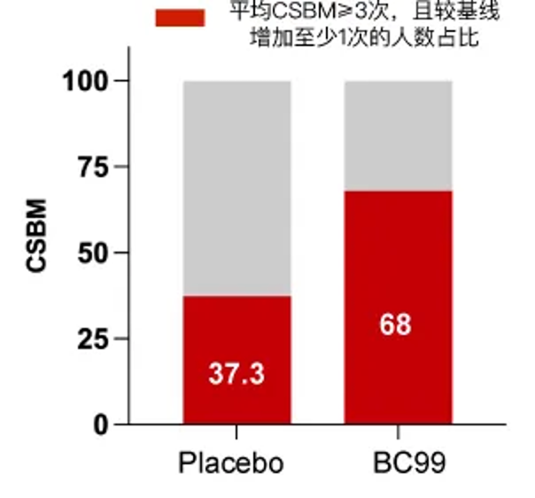 数据显示,BC99组“每周CSBM≥3次”且“较基线增加≥1次”的人数比例显著高于安慰剂组。表明BC99对肠道动力的改善不仅有效,更具有较好的确定性和普适性,能够帮助更多人实现从“不畅”到“通畅”的跨越。