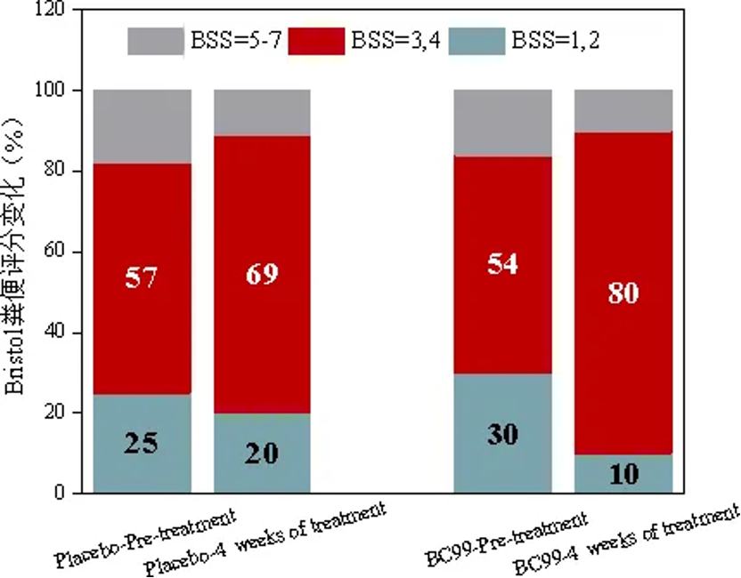干预4周后,BC99组受试者的粪便性状依据Bristol量表评价,发生显著改善。BC99组受试者的粪便性状在3~4型健康区间占比从54%提升至80%,表明BC99改善了由便秘引发的粪便干结等核心问题。