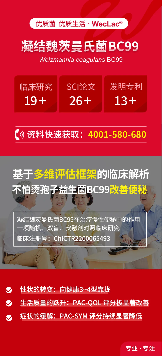 通过凝结魏茨曼氏菌BC99的临床研究数据,Bristol分型的正向转变、PAC-QOL评分的显著提升及PAC-SYM评分的有效降低,充分表明该菌株在改善粪便性状、缓解便秘症状、提升患者生活质量上的显著价值。