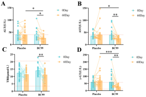 1、一项随机、双盲、安慰剂对照临床研究,BC99在改善长期饮酒者肝功能和肠道微生物群的影响。