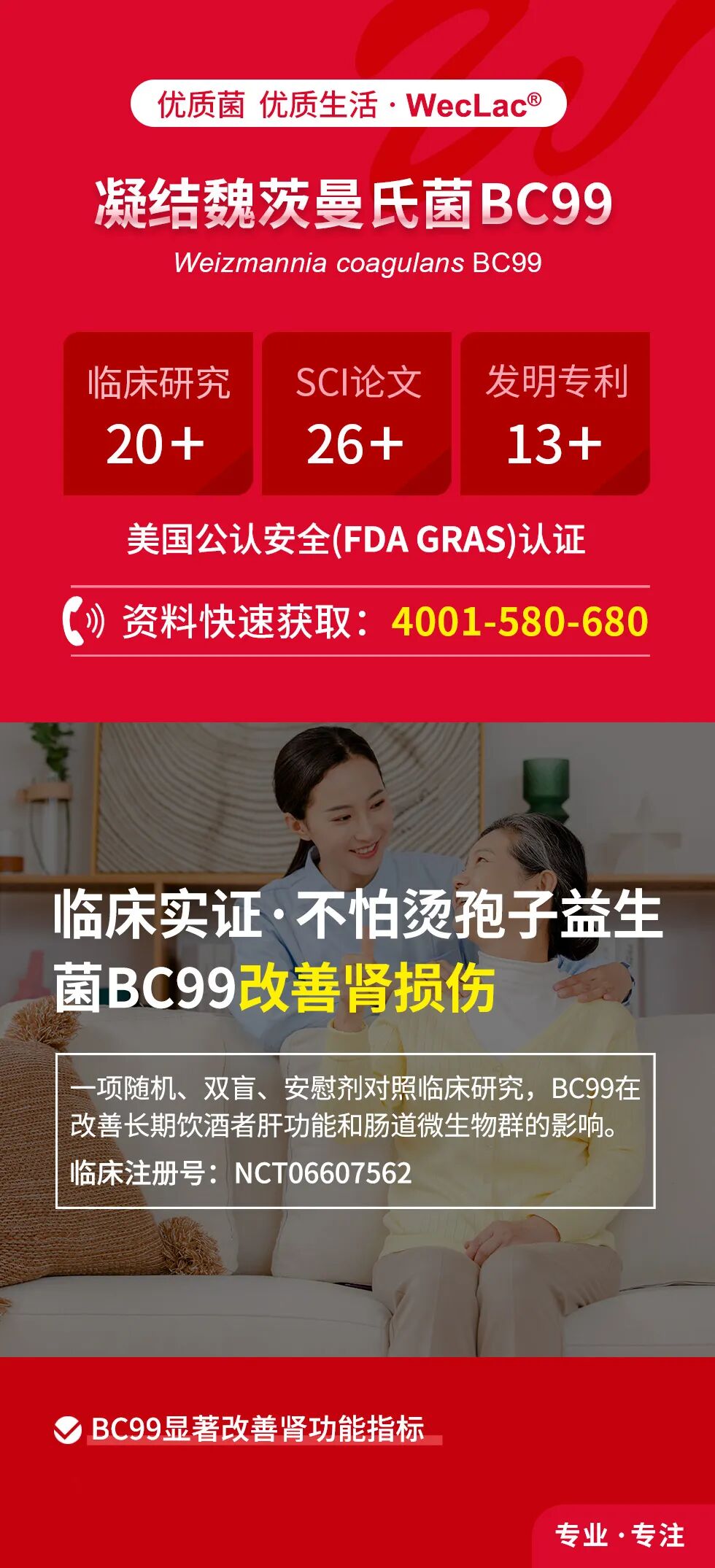 作为微康益生菌的王牌菌株,凝结魏茨曼氏菌BC99始终坚持循证医学路径,以临床循证为支撑,用数据验证价值。本研究结果表明,BC99在改善高尿酸相关代谢指标、维护肾功能方面具备潜在应用前景。BC99以其稳健的效果与可靠的安全性,在代谢健康管理领域展现出重要的应用前景。
