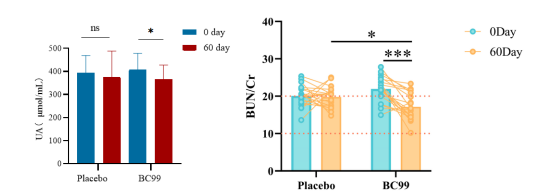 BC99干预60天后,与安慰剂组相比,BC99可显著降低受试者尿酸水平,同时受试者的BUN/Cr与基线相比极显著降低,与安慰组相比也显著降低;而安慰剂组没有显著变化。临床结果表明,BC99具有潜在的降尿酸、改善肾功能的作用。