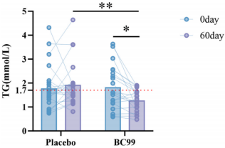如图 1 所示,与安慰剂组相比,经过 60 天干预后,BC99 组甘油三酯(TG)水平显著降低;与基线相比,甘油三酯指标异常的受试者人数减少。