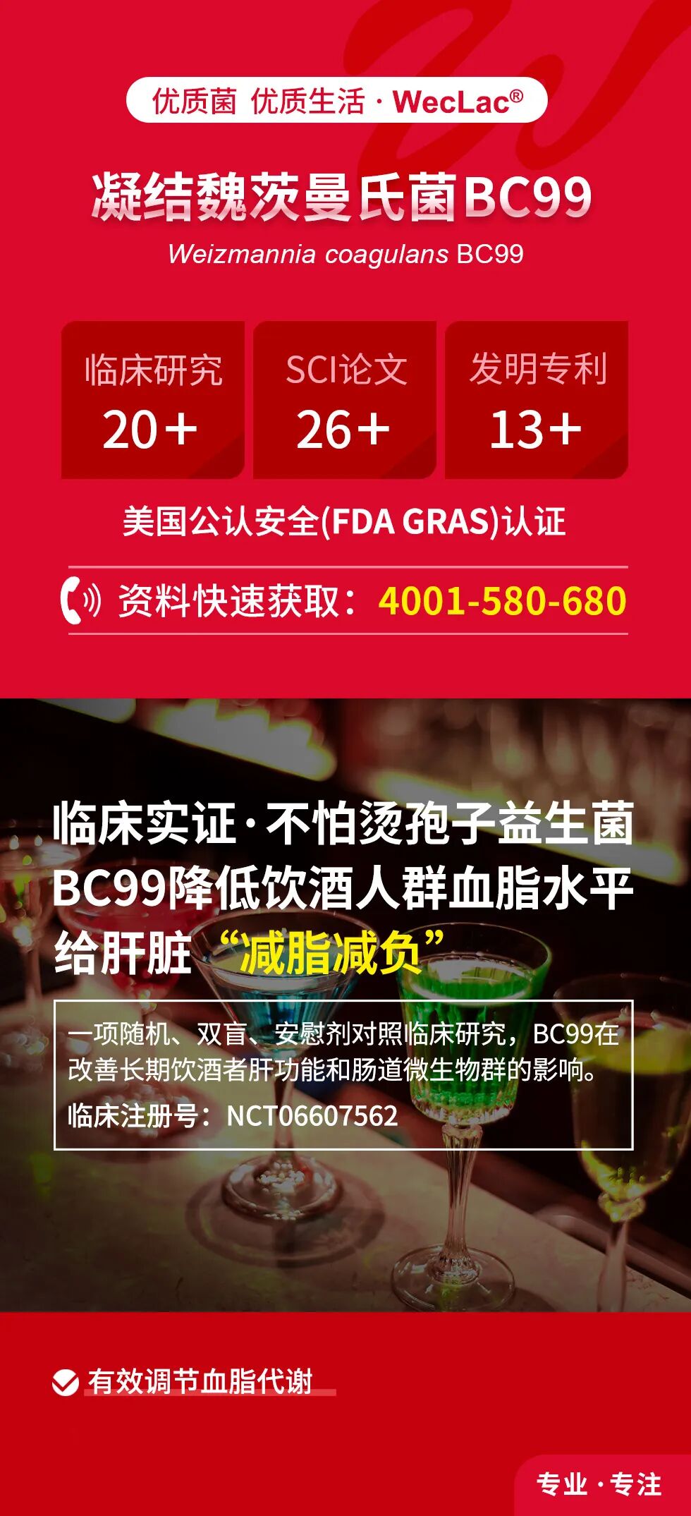 作为微康益生菌的王牌菌株,凝结魏茨曼氏菌BC99始终坚持循证医学路径,以临床循证为支撑,用数据验证价值。本研究结果表明,BC99能够显著降低长期饮酒者升高的甘油三酯水平,恢复脂代谢平衡,从血脂维度为肝脏“减脂减负”。BC99以其稳健的效果与可靠的安全性,在酒精相关代谢健康管理领域展现出重要的应用前景。