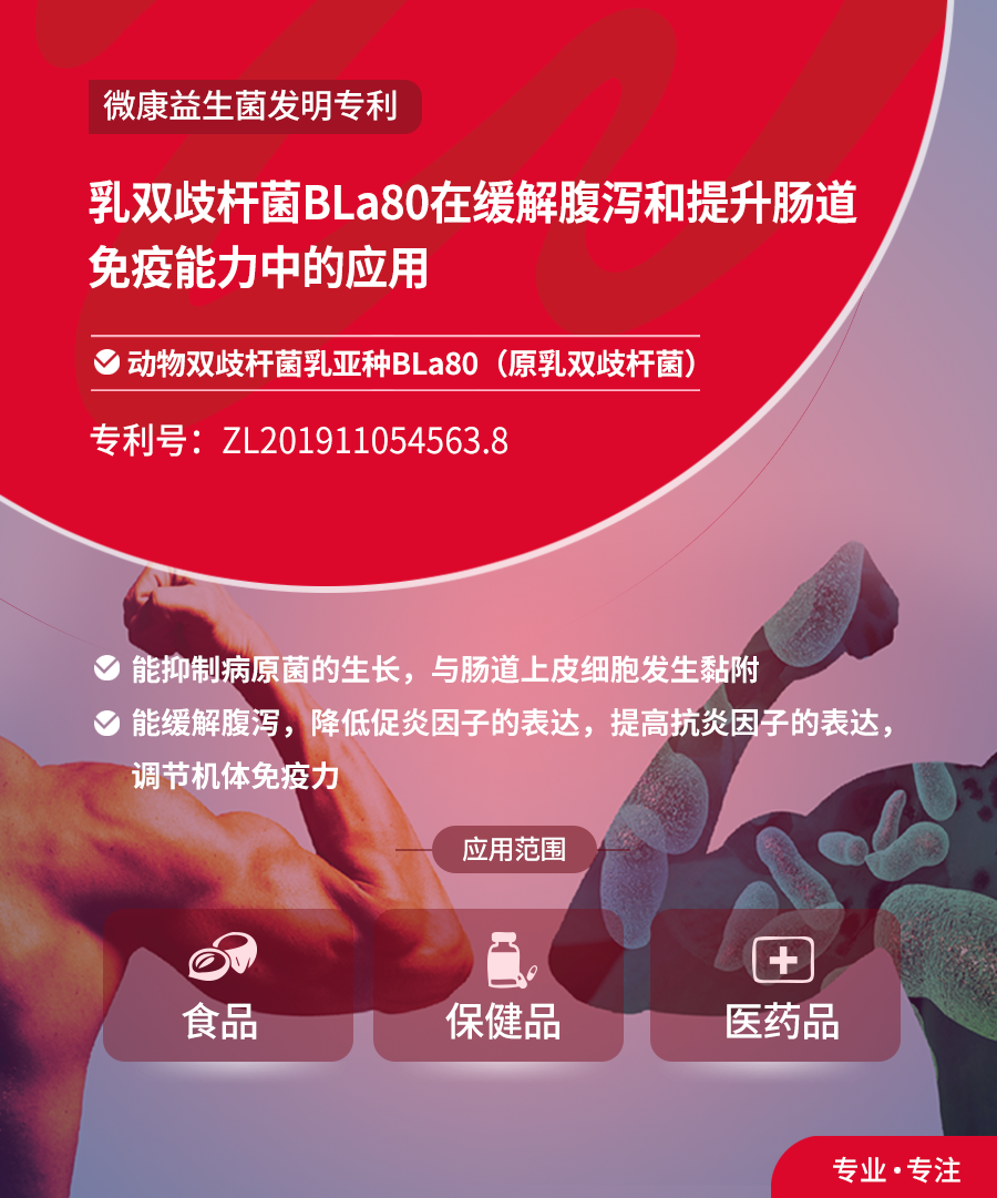 微康益生菌专利菌株动物双歧杆菌乳亚种(原乳双歧杆菌)Bifidobacterium animalis subsp. lactis BLa80分离自中国海拔3500m以上边远牧区的母乳样品。