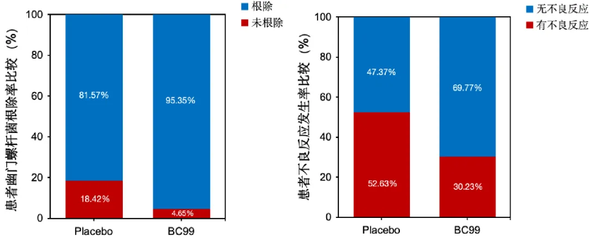BC99使幽门螺杆菌根除率从82%提升至95%,降低四联铋剂不良反应的发生率,从53%降低至30%,恶心发生率从47%降低至28%,减轻胃肠道不适症状,尤其在改善饥饿时胃部疼痛和反酸症状方面效果显著,BC99促进胃酸分泌功能恢复[2]。